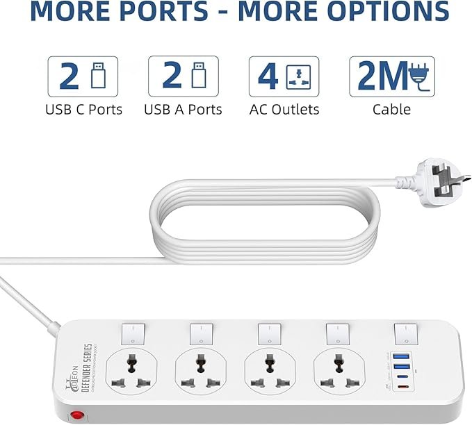 The 2-meter heavy-duty 3-pin cord provides flexibility and convenience, making it ideal for both home and office setups. Its durable white body and compact design ensure long-lasting performance while maintaining a clean and modern look.