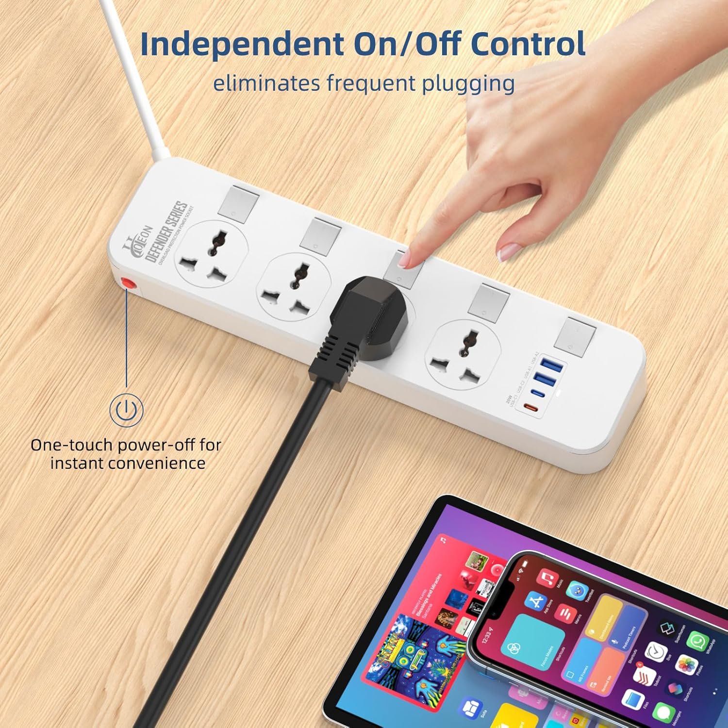 The built-in 4 USB ports (3.4A total output) let you charge smartphones, tablets, power banks, Bluetooth devices, and more—without needing extra adapters. Each socket comes with an individual switch, giving you full control over power usage and helping save electricity.
