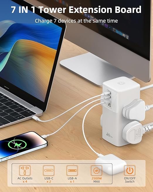 Stay powered, stay organized, and keep your devices safe with this compact and intelligent 7-in-1 tower extension board. Perfect for all your charging and power needs!