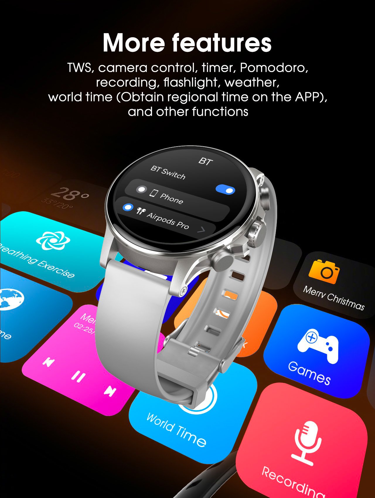 • Additional Functions: Voice communication, notification sync, music control, and customizable watch faces