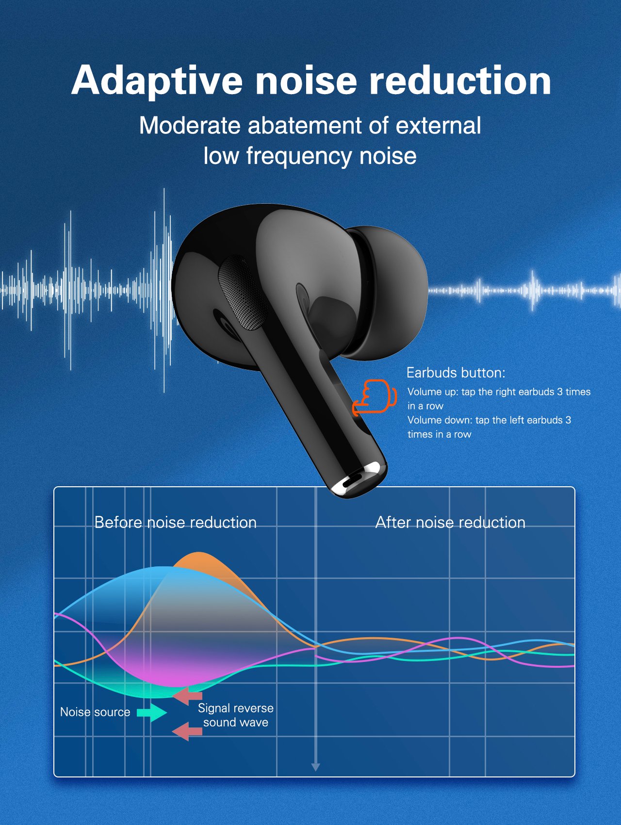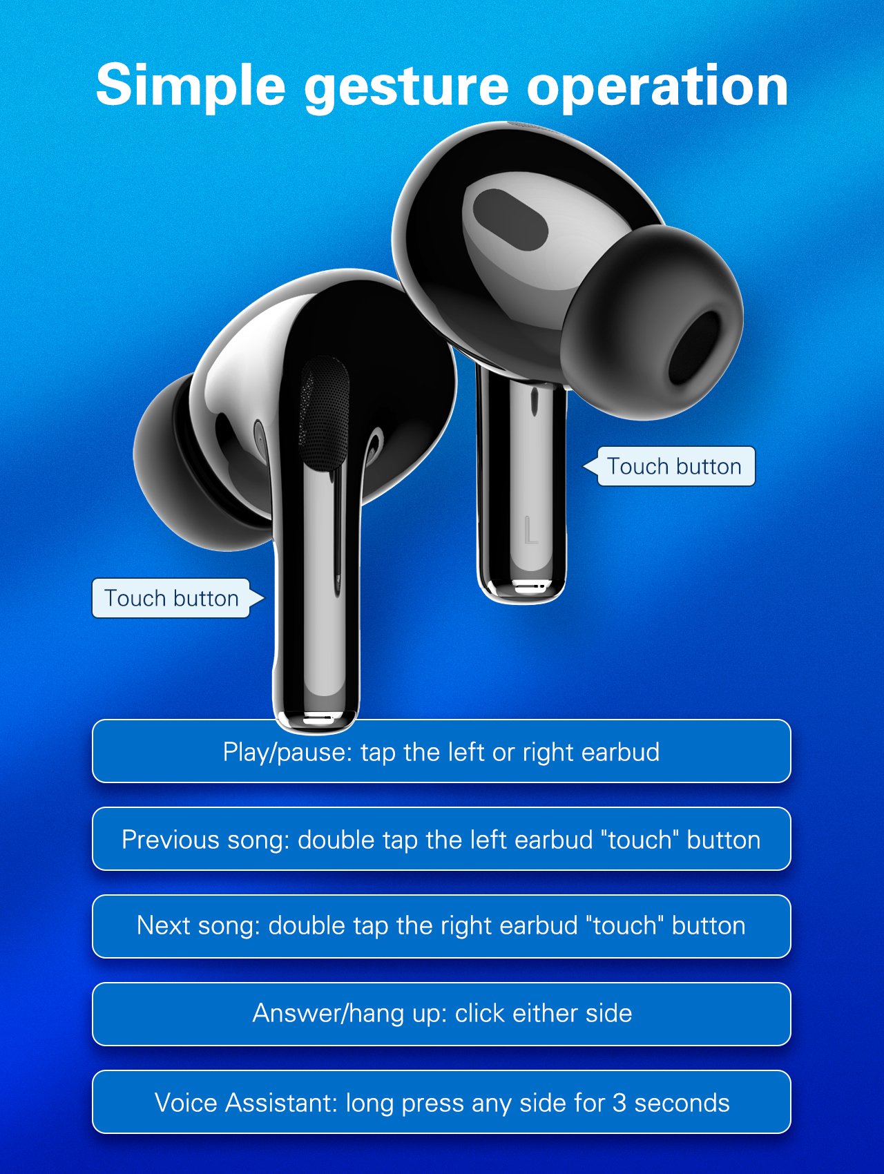 Each earbud features a 30mAh battery, offering approximately 3–4 hours of music playback or call time on a single charge. The 300mAh charging case provides additional power throughout the day and fully recharges in about 1 hour via a convenient USB to Type-C charging port.