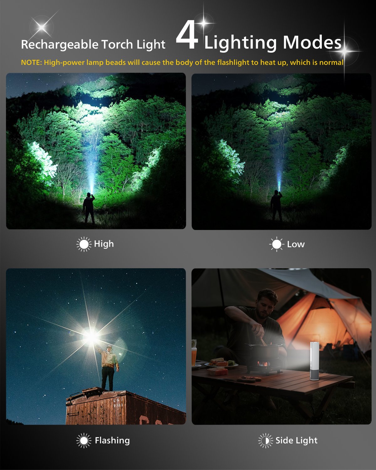 Modes: High / Low / Flashing / Side Light / Off