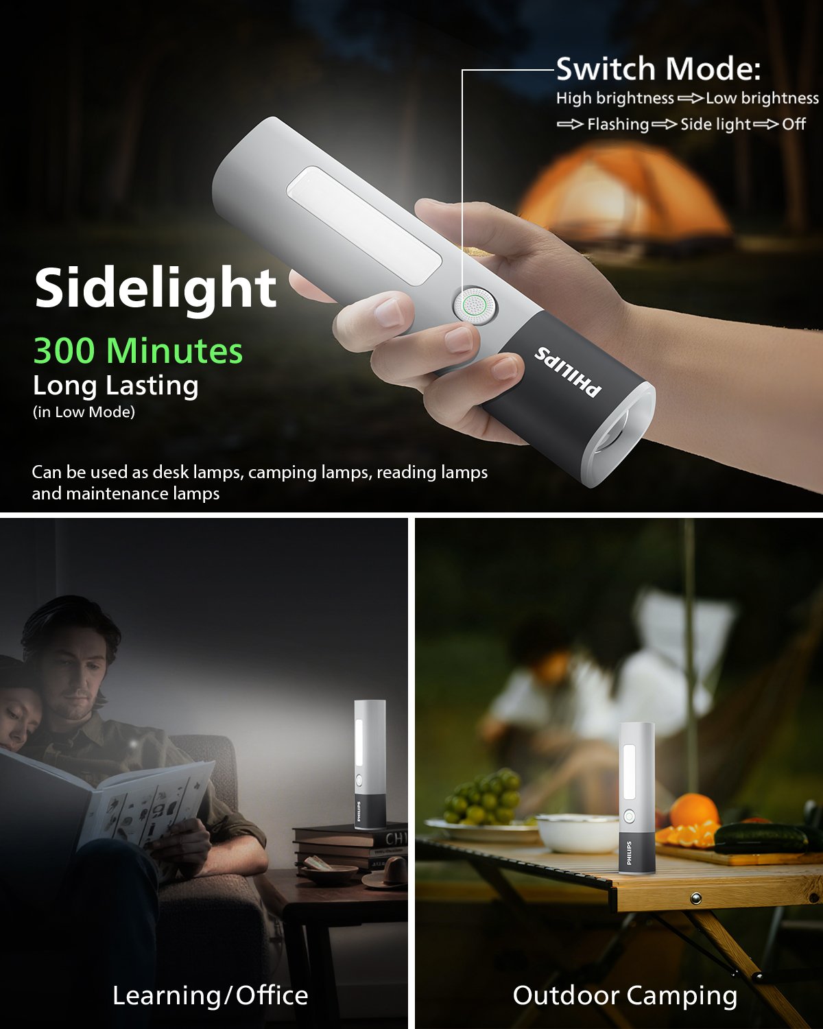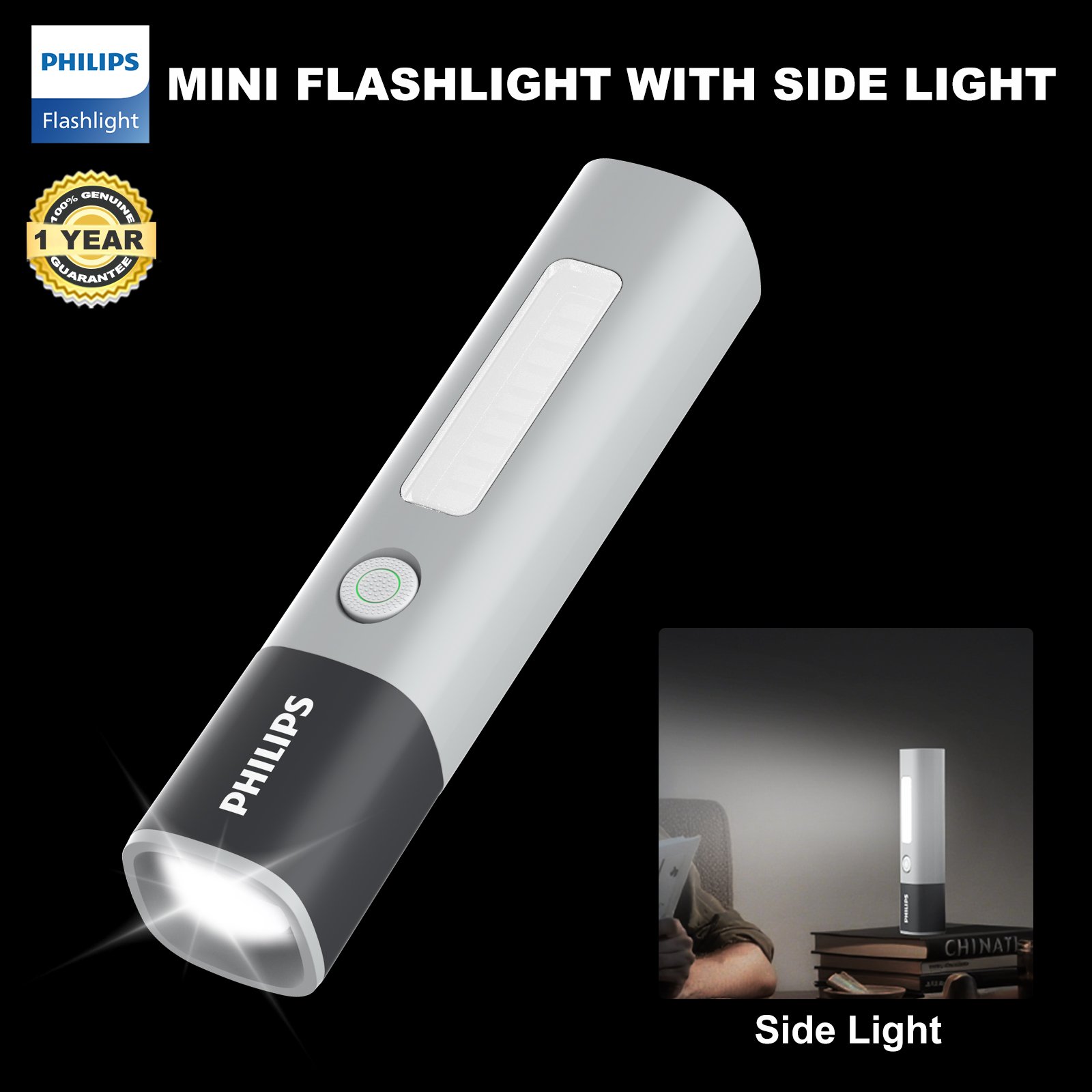 The side white light works great as a reading lamp, desk light, or emergency work light.